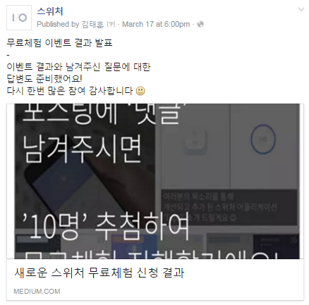 2. 하지만 읽는 것과 해당 콘텐츠에 '참여' 하는 건 역시 별개의 문제 인 것 같다. 지난 포스팅/이번 포스팅 모두 참여한 사람은 17명 지난 포스팅 참여 인원 중 24%밖에 되지 않는다.3. 다른 페이스북 페이지에서의 '이벤트 결과' 관련된 포스팅의 경우 일반 포스팅에 비해 '참여'가 낮은 경우가 대부분이지만, 왜 일까? 이유는 아직 모르겠다. 관련된 내용을 좀 더 공부해서 내용을 포스팅해야겠다.