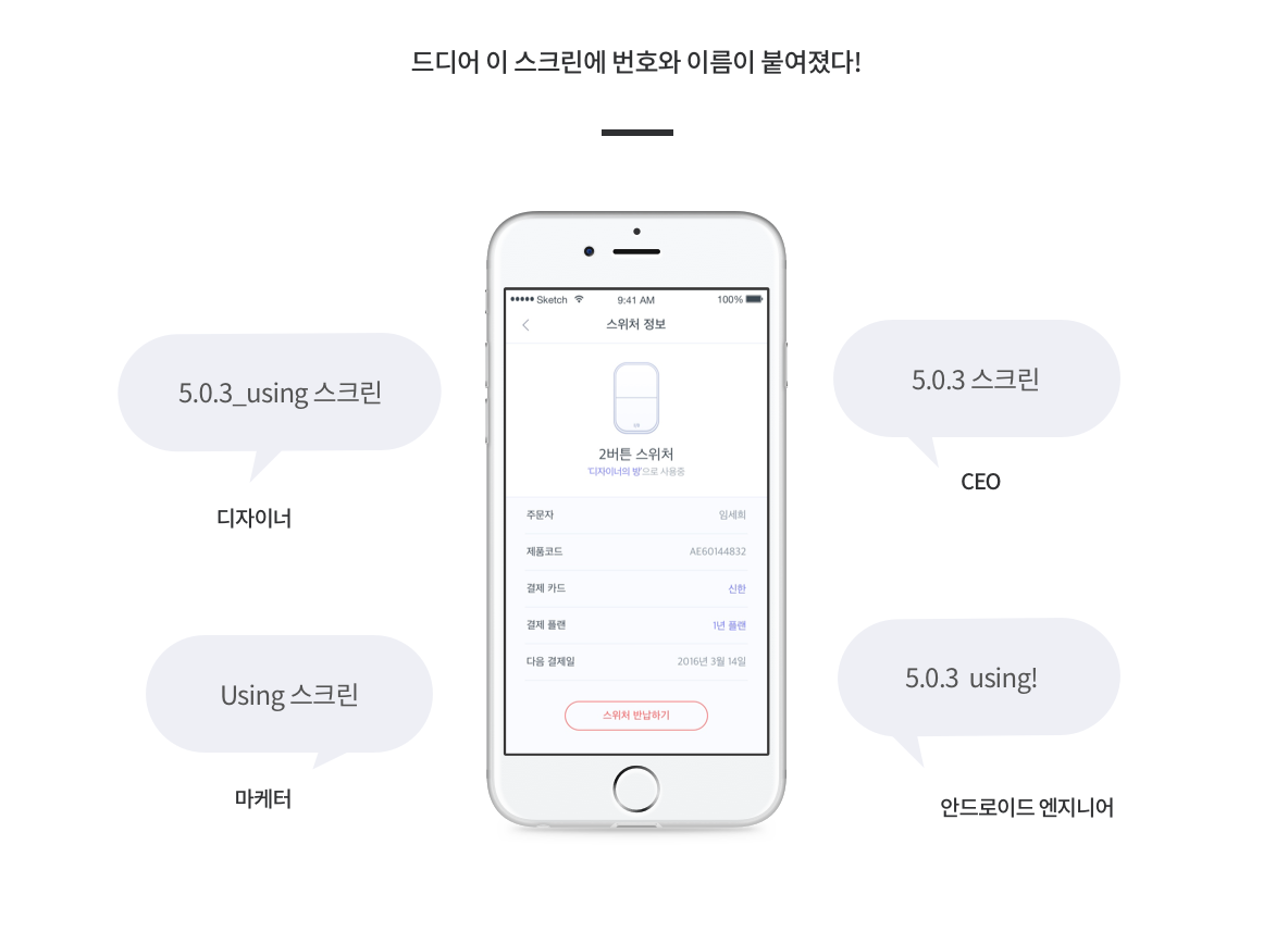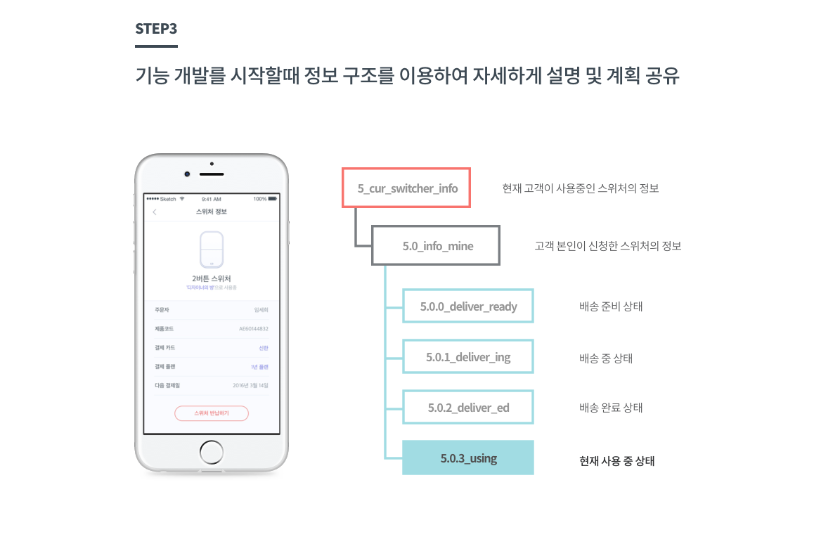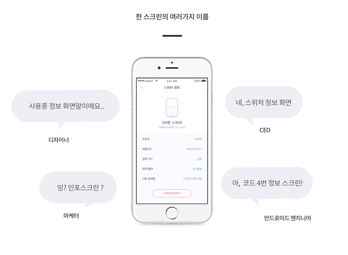 아이오에서는 단 한 명의 디자이너가 4개월이라는 기간 동안 브랜딩, UIUX 그리고 심지어 하드웨어 제품 디자인까지 해왔으므로 시간과 공을 들여서 시스템 체계를 정리하고 싱크 하는 것이 불가능했다. 하지만 정보 구조의 부재로 팀 전체가 사용하는 통일된 언어가 없다 보니, 알고 보니 30분 동안 서로 다른 스크린을 두고 토론을 벌이는 현상이 일어나거나 플로우를 다르게 기억하고 개발하는 일이 일어났다.