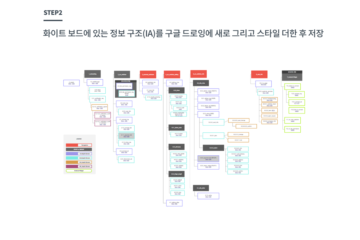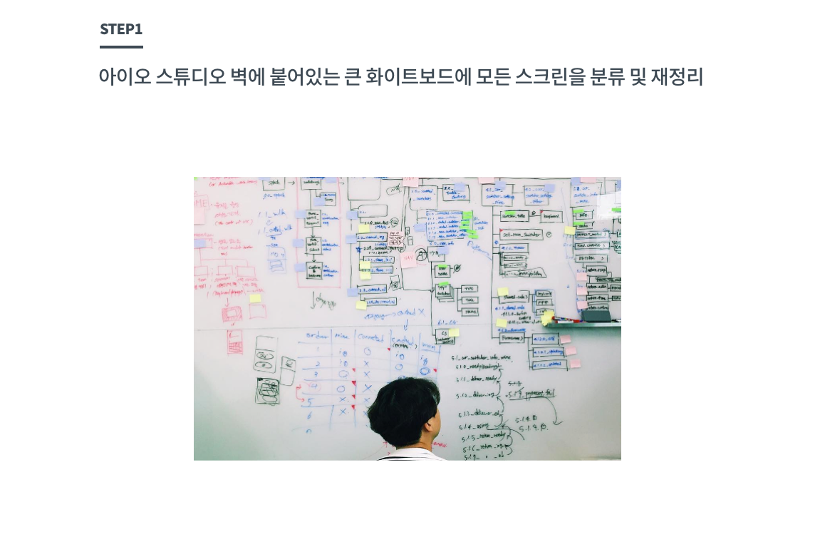 "안 그래도 추가할 기능이 많은데 굳이 그 작업을 지금 해야 하나", "충분히 머릿속에 다 그려지는 간단한 구조다"라는 의견이 있었지만, 더 자세히 들여다보니 iOS와 안드로이드에서 플로우 차이가 나는 구간이 여러 곳 있었고 팀원끼리 동문서답을 하는 경우도 많아서 더 이상 미룰 수 없는 작업이라고 결론을 내렸다. 준비 단계로 iOS와 안드로이드 앱을 나란히 두고 스크린을 맞춰보는 작업을 시작으로 대표와 함께 스튜디오에 있는 큰 화이트보드에 여기저기 흩어져있었던 스크린을 하나도 빠짐없이 그리기 시작했다. 그렇게 화이트보드 여기저기 그려진 모든 스크린 위에 다른 색상의 포스트잇으로 내비게이션 뎁스(Depth)에 나눠서 스크린을 분류하고 그룹을 지었다. 어느 정도 화이트보드 위에 상하구조가 정리가 된 후에는 마무리 작업으로 스크린마다 번호와 영문 라벨을 붙이고 모든 멤버가 원할 때 열어볼 수 있도록 구글 드로잉에 옮겨 저장했다.