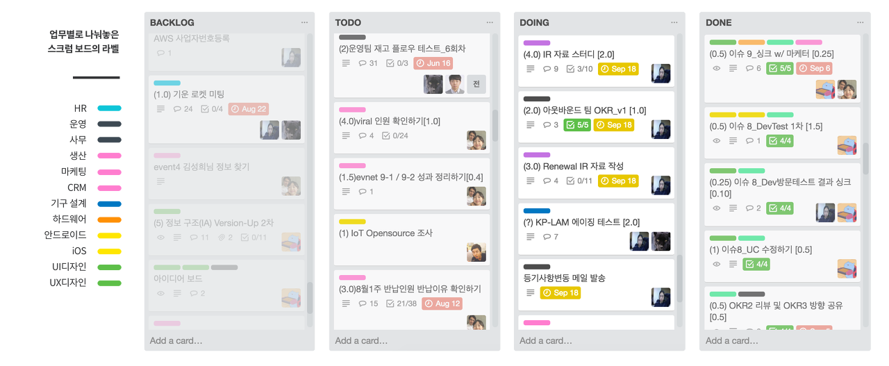 아이오의 CEO, 엔지니어, 디자이너, 마케터 등 모든 팀원의 업무가 담겨있는 스크럼 보드, 고객의 목소리 또한 이 곳에 같이 섞여있었다.