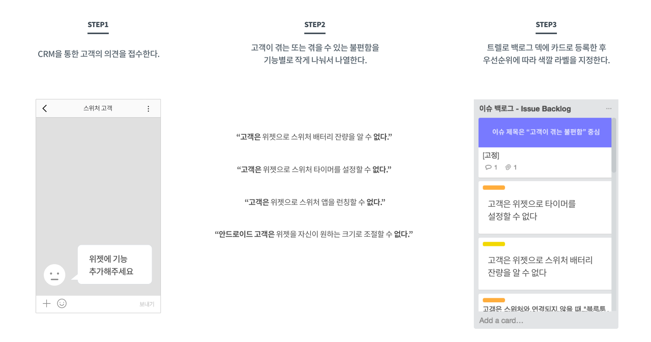 개발할 것들은 넘쳐나는 상황에서 더욱 혼란스러운 것은 고객들이 겪고 있는 문제를 수집하고 관리하는 공간과 우선순위를 정하는 시스템의 부재였다. 조직 구성원 모두가 쓰는 트렐로 스크럼 보드의 백로그 덱에 이러한 내용을 등록할 수 있었지만, 이 보드에는 앱뿐만 아니라 하드웨어, HR, 운영, CRM, 미래의 제품 계획 등 모든 아이디어 및 이슈가 다 섞여있기 때문에 고객의 목소리에 집중할 수 없었다.