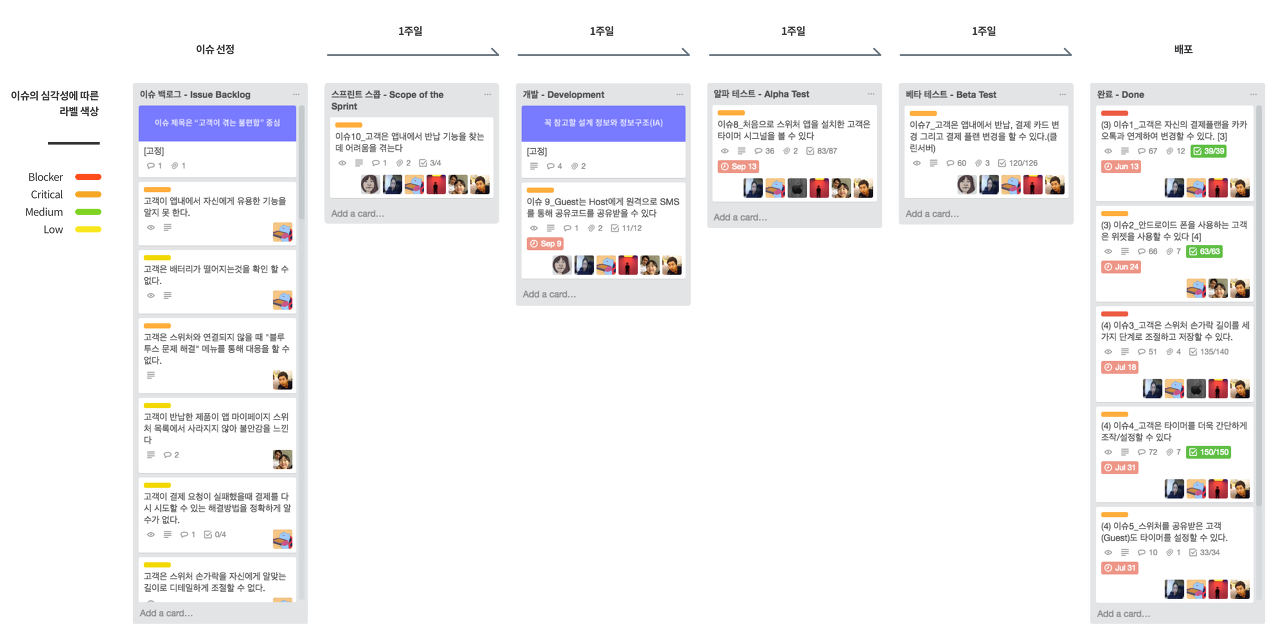 기존에 사용하던 트렐로 스크럼 보드에서 분리되어 실제 고객들이 제품(앱과 하드웨어)을 사용하면서 불편을 겪고 있는, 또는 겪을 가능성이 있는 이슈만 모아서 관리하는 보드를 만들었다. 이 보드에는 고객의 의견뿐만 아니라 팀원들 또한 예상되는 이슈나 고객에게 필요하다고 생각되는 기능도 등록할 수 있다.