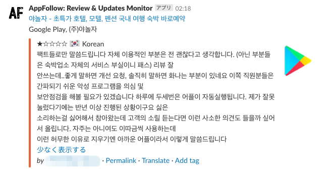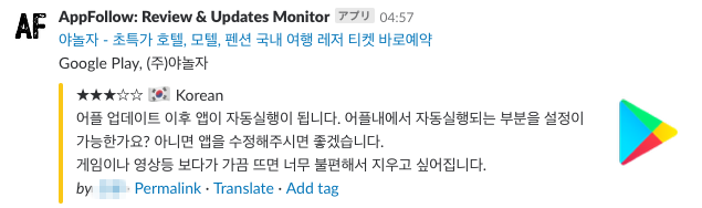언제부터인가 야놀자앱을 설치하거나 업데이트하면 앱이 자동으로 실행된다는 리뷰가 들어오기 시작했습니다.
