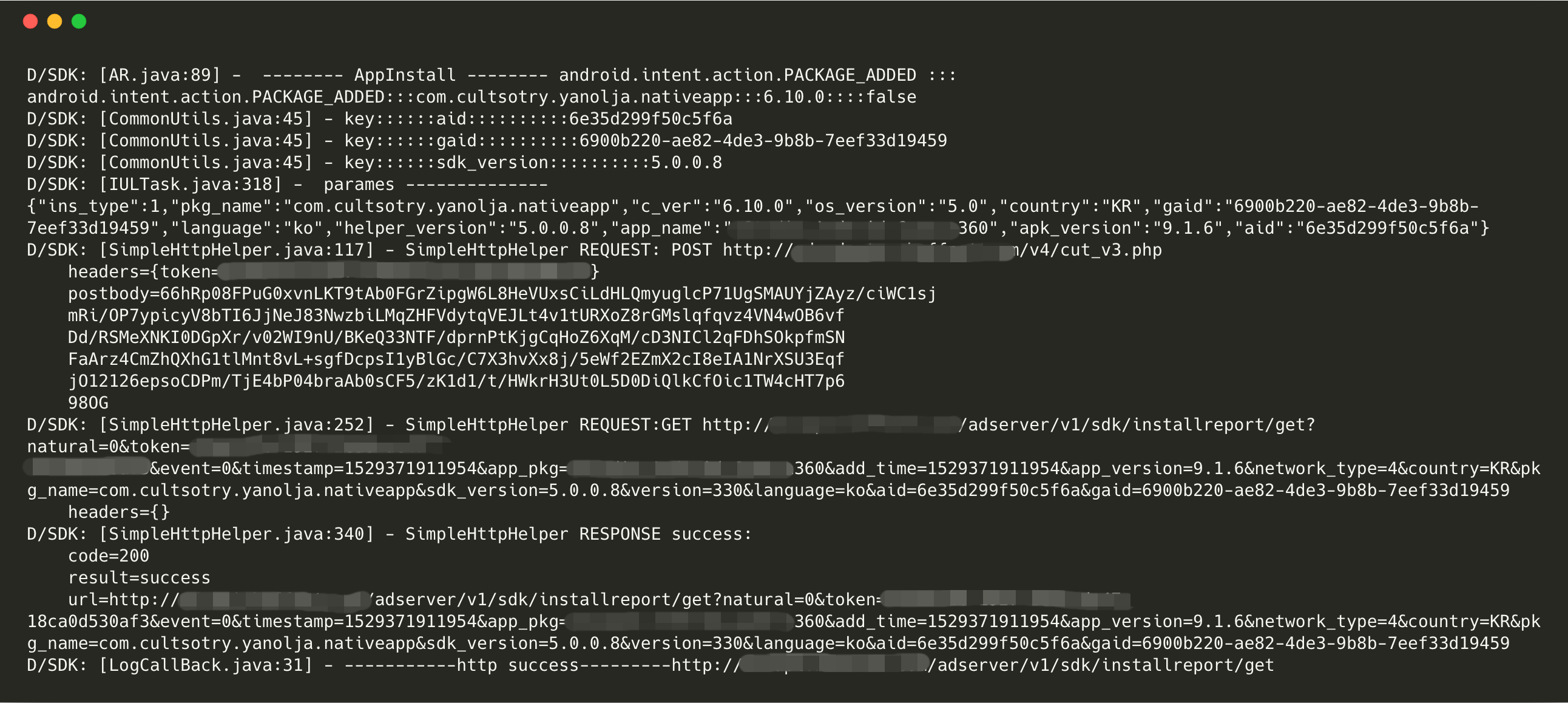 앱 설치 후 광고 SDK가 수집하는 것으로 보이는 Log에는 다양한 항목들이 나열되는 것을 볼 수 있습니다. 이때 설치한 앱의 정보가 SDK를 통해 특정 API로 전송되는 것도 확인할 수 있습니다. 하지만 Log는 Log일 뿐입니다.