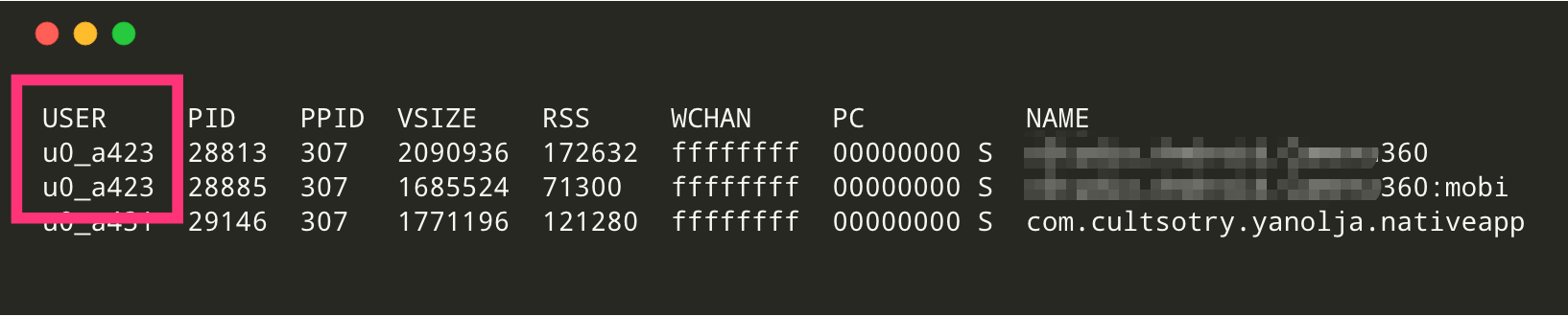 Activity Dump에서 확인한mCallingUid는u0a423였는데, 이는 Activity를 호출한 uid 값을 가리킵니다. 실제로 Process 가 호출되는 Application ID도 카메라 앱에서 호출한 ID 정보와 일치합니다.