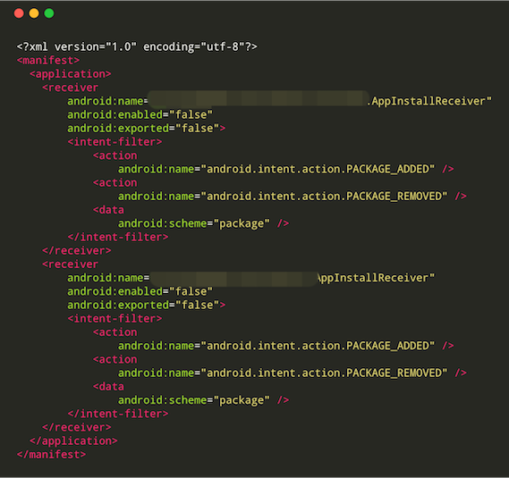 단순하게는 APK 를 분석하여 추측하는 방법이 있습니다. Android Studio 에서 제공되는Analyze APK기능을 이용하여 해당 앱에서 사용되는 서비스의 정보를 파악할 수 있습니다. 이 방법을 이용하여 문제의 앱이 사용하는 광고 SDK 서비스에서 패키지 설치/제거 관련 Broadcast Receiver를 수집하는 것을 확인 할 수 있습니다.