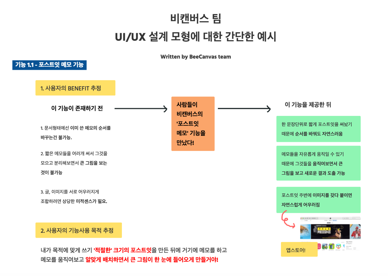 위 사진에서 볼 수 있듯, 포스트잇 메모 기능이 있기 전과 후가 어떻게 다른 지에 대해 먼저 설명한다. 이 기능이 사람들에게 어떻게 선물처럼 다가갈 수 있는지 말해주고, '사용자의 기능 사용 목적'을 추정하여 알려준다. 즉, '우리 팀', '내 의도'는 아직 등장도 하지 않는다. 내 이야기를 하는 것이 아니다. 내 머릿속의 기획을 이야기하는 것이 아니다. 우리 고객이 어떻게 이 기능을 사랑하게 될 것이고, 이 기능을 어떤 목적으로 활용하게 될 것인지 고객 사이드로 설명한다.