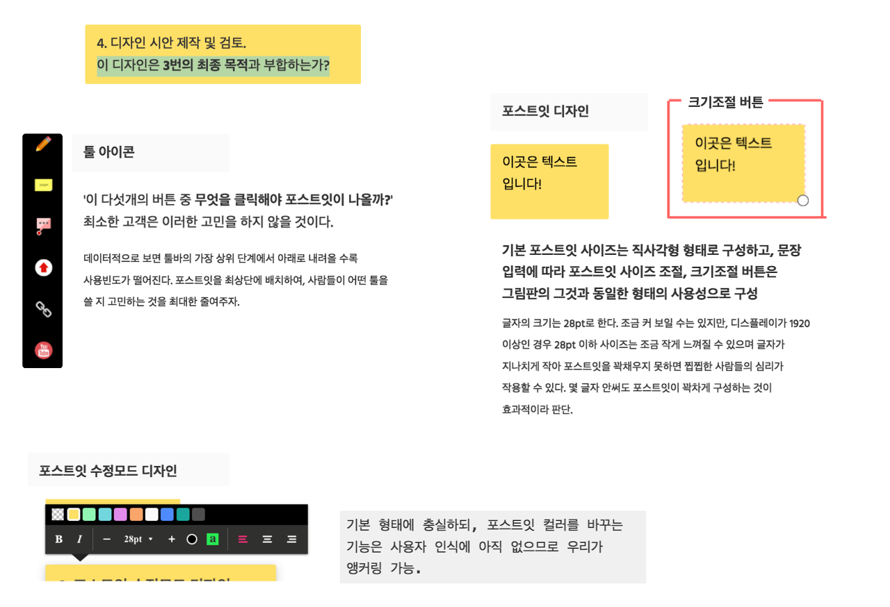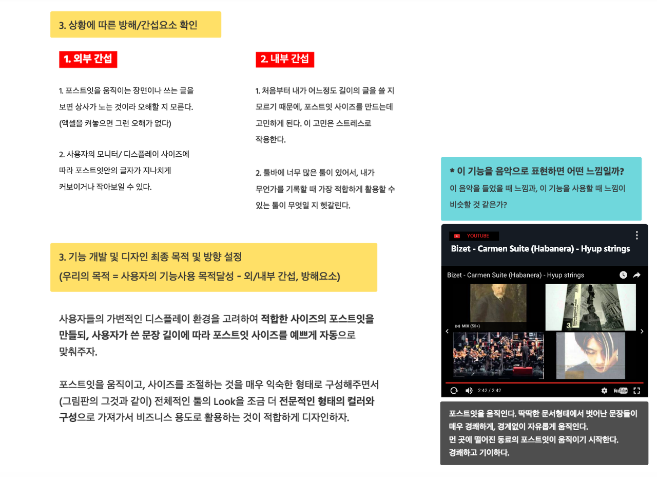 이제 어떻게 움직일지 고민하는 단계다. 그전에 우리는 이미 고객이라는 상상 속에 빠져있으니, 고객 입장에서 포스트잇 기능을 사용해볼 때다. 포스트잇 기능을 사용할 때 외부적인 간섭이나 방해는 무엇이 있을까? 포스트잇이라는 게 액셀처럼 멋지게 구조화된 형태가 아니라서 상사가 내가 노는 줄 알고 눈치를 줄지도 모르겠고, 내 10년 된 17인치 모니터에서는 포스트잇 글자가 조금 작아 보일지도 모르겠다. 서비스 내부적인 간섭 요인도 이런 식으로 상상이 가능하다.