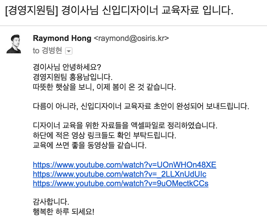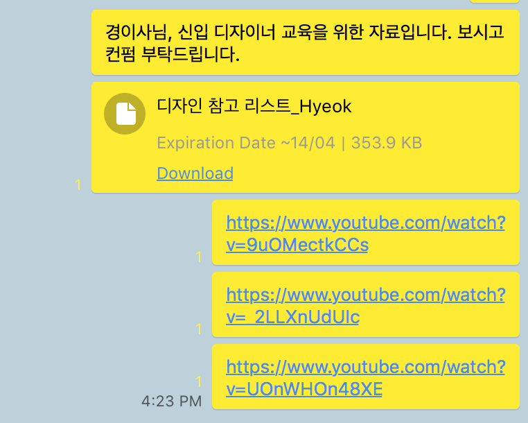 이메일의 경우 깔끔하게 정리해서 보내기는 편하고 받는 사람 입장에서도 관리하기는 편하지만, 우선 이메일을 보내는 데 너무 많은 형식적인 요소들(형식적 인사와 덕담들)이 필요할 뿐만 아니라, 보내는 자료나 링크들에 대해서도 일일이 설명을 해야 한다. 상급자가 다운로드하기 전에, 링크를 클릭하기 전에 이게 무슨 자료인지를 이해할 수 있어야 하기 때문에, 사실상 이메일은 자료 명세서에 가깝다.