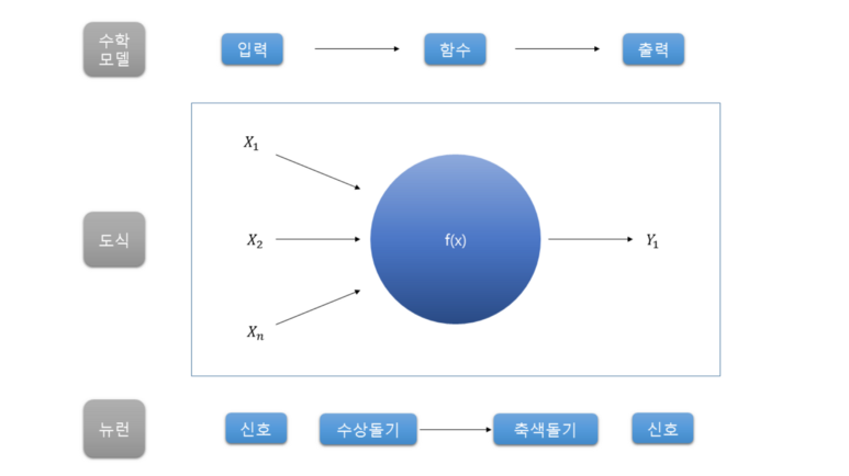 입력값들(X)에 가중치를 두어(W) 값(f(x))을 구하고 그 값과 임계치와의 관계를 활성함수(active function)로 판단하여 결과값을 출력하는 것입니다.