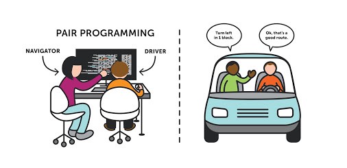 페어 프로그래밍은 애자일 개발 방법론 중의 하나로 하나의 개발 가능한 PC 에서 두 명의 개발자가 함께 작업하는 것을 말합니다. 네비게이터(navigator)가 전략을 제시하고 드라이버(driver)가 실제 코드를 작성하며, 이 열할을 각자 번갈아가며 수행합니다. 짝 프로그래밍이라고도 합니다.