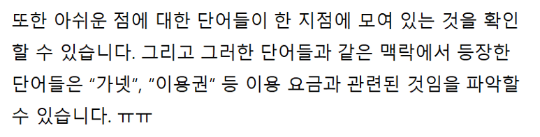 아쉬운 점과 관련된 단어 / 같은 맥락에서 등장한 단어들