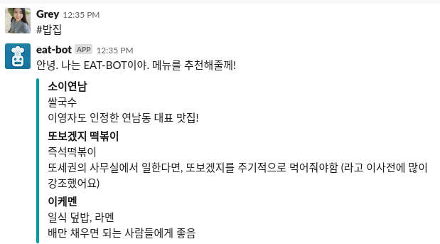 def lambda_handler(event, context): slack_url = "{YOUR_SLACK_INCOMING_WEBHOOK_URL}" eat_list = getRandomDatas() fields = [] for data in eat_list: tmp_title = data['title'] if data['url'] != "": tmp_title += "<{}>".format(data['url']) fields.append({ "title":tmp_title, "value":"{}\n{}\n".format(data['menu'], data['description']), "short":False }) title = "안녕. 나는 EAT-BOT이야. 메뉴를 추천해줄께!"