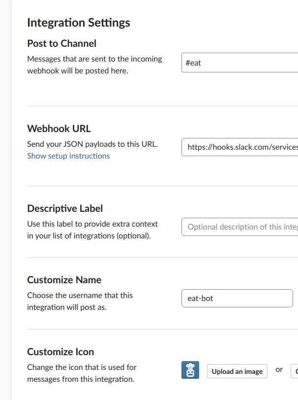 제일 먼저, 슬랙에 Incoming WebHooks를 추가합니다. 어떤 채널에 메세지를 보낼것인지 선택합니다. Channel이 아니라 DM에도 추가 가능합니다. 채널은 수정가능합니다. 일단저는 #eat채널에 webhook을 등록하였습니다. 이어서 봇의 이름과 이미지를 설정합니다.