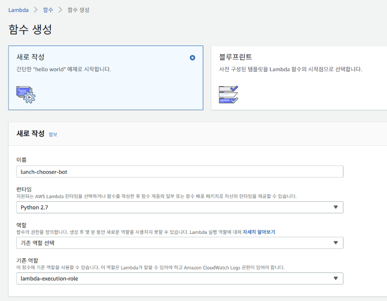 AWS Lambda(https://aws.amazon.com/ko/lambda/)의 함수를 하나 먼저 생성합니다.