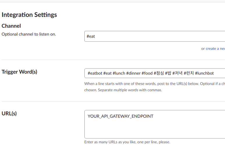 마지막으로, 유저가 채널에서 특정 키워드를 입력하면 해당 api gateway endpoint를 호출하도록 하기 위해 Slack OutGoing Webhooks을 추가하면됩니다!