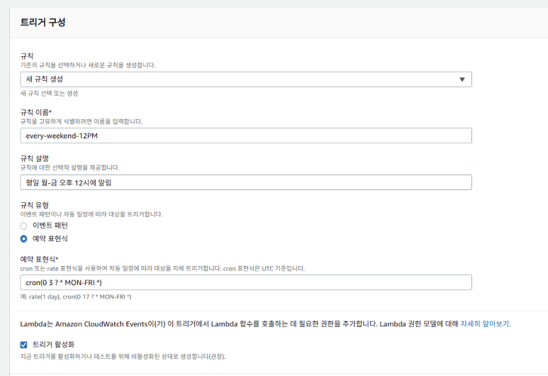 제가 만든 eat-bot의 경우 월-금 12시 정오마다 메세지를 보내도록 하기 위해서 cloud watch를 추가했는데요. 간단한 cron식을 작성하기만 하면, cloud watch가 해당 lambda를 호출합니다.
