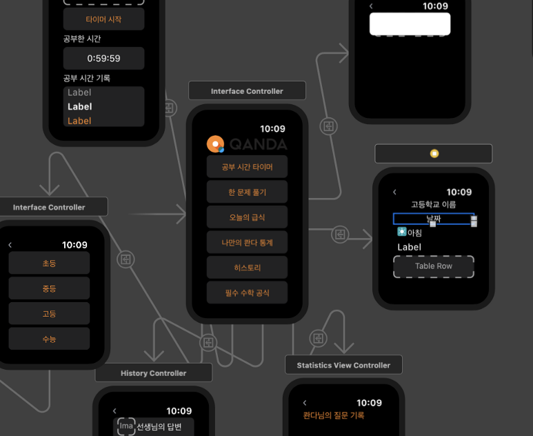 기능을 구체적으로 정하기 전에 저희가 만드려고 하는 Watch App은 크게 선생님 Watch App과 학생 Watch App 두가지 였습니다. 작은 화면을 사용하는 Watch App의 경우 디자인적으로 자유도가 떨어져서 디자인은 일단 크게 고민하지 않고 기존 앱들을 참고하고 되도록 간단하게 만들려고 했습니다. 기능을 추가하기 위해 현재 App에서 사용하는 기능을 다시 살펴보고 사용할 수 있는 API를 나열해서 후보군을 좁혀나갔습니다. Apple Watch를 통해 사진 촬영이 가능하지 않고 사진을 불러오는 것도 제한적이라서 일단 가장 중요한 검색 기능이나 질문 기능은 고려하지 않았습니다. 다른 부족한 부분들은 Watch App에서 가장 유용하는 쓰는 기능 중 하나인 Push Notification을 통해 보완될 수 있다고 보았습니다. 그렇게 정해진 후보는 선생님 앱의 경우 현재 풀 수 있는 문제 수, 히스토리 API를 사용하고자 했고 학생앱의 경우 급식 정보, 히스토리, 한 문제 풀기 그리고 나만의 콴다 통계( 예전에 사용하였으나 지금은 사용하지 않는 API ) API를 사용하는 것이 Watch App에서 사용하였을 때 실용성이 있을 것으로 판단했습니다. 추가적으로 2시간 정도 남는 시간을 활용하여 간단한 공부시간 타이머와 필수 수학 공식을 보여주는 기능도 추가하였습니다. 또한 나만의 콴다 통계의 경우 팀원 중 Nutella의 도움으로 JSON을 전달하면 그래프로 그려주는 API를 사용하여 구현하였습니다.