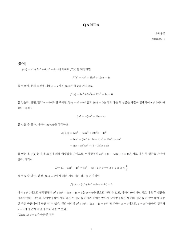 콴다에 올라온 문제 중 가장 어려웠던 문제는 ‘미적분 2’ 단원의 문제로, 함수의 극값을 이용하여 4차 함수의 계수를 결정하는 문제였습니다. 이 문제를 풀기 위해 무려 53명의 콴다 선생님이 시도하였고, 결국은 ‘대굴대굴’ 선생님의 답변이 채택되었습니다. 대굴대굴 선생님은 17년부터 콴다 선생님으로 활동한 헤비유저 중 한 명으로 서울대학교를 졸업하고 현재는 일리노이 주립대학에서 석사과정을 밟고 계신 것으로 알고 있어요. 이 선생님의 경우 항상 난이도가 극상인 문제들만 푼다는 것과 위 사진처럼 답변을 pdf 파일로 매우 높은 퀄리티로 작성하시는 성향이 있습니다. 답변 내역만 봐도 수학에 대한 내공이 적지 않은 것으로 보이네요..!