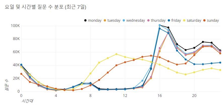 학생들은 언제 공부를 가장 많이 할까요? 기본적으로 학생들의 공부 패턴은 크게 ‘학기 중’과 ‘방학 중’ 두 가지 시기로 구분되는데, 학기 중에는 ‘수요일’, 방학 중에는 ‘월요일’에 질문 수가 가장 많습니다. 그리고 공통적으로 ‘토요일’에 질문 수가 가장 적습니다. 학생들도 친구들과 놀거나 휴식을 취하는 시간은 토요일에 가장 많이 가지기 때문이죠.