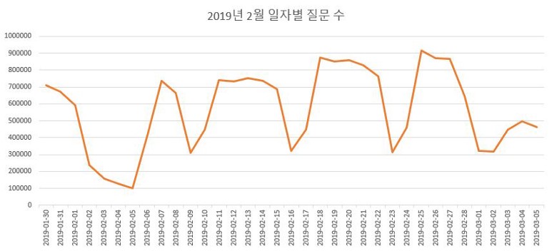 그럼, 일 년 중 공부를 가장 많이 하는 날과 적게 하는 날은 각각 언제일까요? 최근 1년 동안 질문이 가장 많았던 날은 2019년 2월 25일, 가장 적었던 날은 2019년 2월 4일입니다. 두 날짜 모두 월요일인 데다가 시기적으로 3주밖에 차이 나지 않는 날이지만, 질문 수가 각각 942,689개, 130,090개로 무려 7배 이상 차이 납니다. 왜 이런 차이를 보일까요? 먼저 2019년 2월 25일은 학생들의 새 학년, 새 학기가 시작되는 개학식을 앞둔 날로 학원도 그렇고 본인 자신도 미리 예습하면서 새 학기를 준비하는 시기입니다. 반면 2019년 2월 4일은 설 연휴로 다들 가족들과 시골로 가는 길이기 때문에 공부량이 현저하게 떨어지는 날입니다.