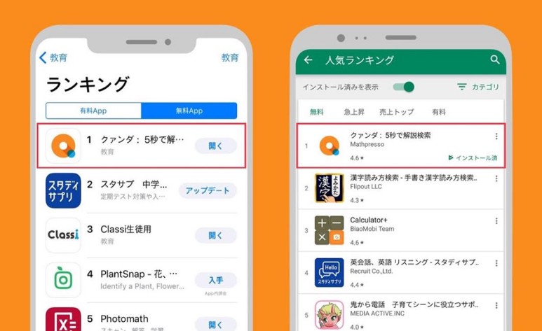 매스프레소의 서비스 ‘콴다’는 일본에서 2018년 11월에 런칭했습니다. 2019년 3월에는 일본 구글 플레이스토어와 앱 스토어 무료 교육분야에서 1위를 기록한 후, 꾸준히 최상위권을 유지해오고 있습니다.