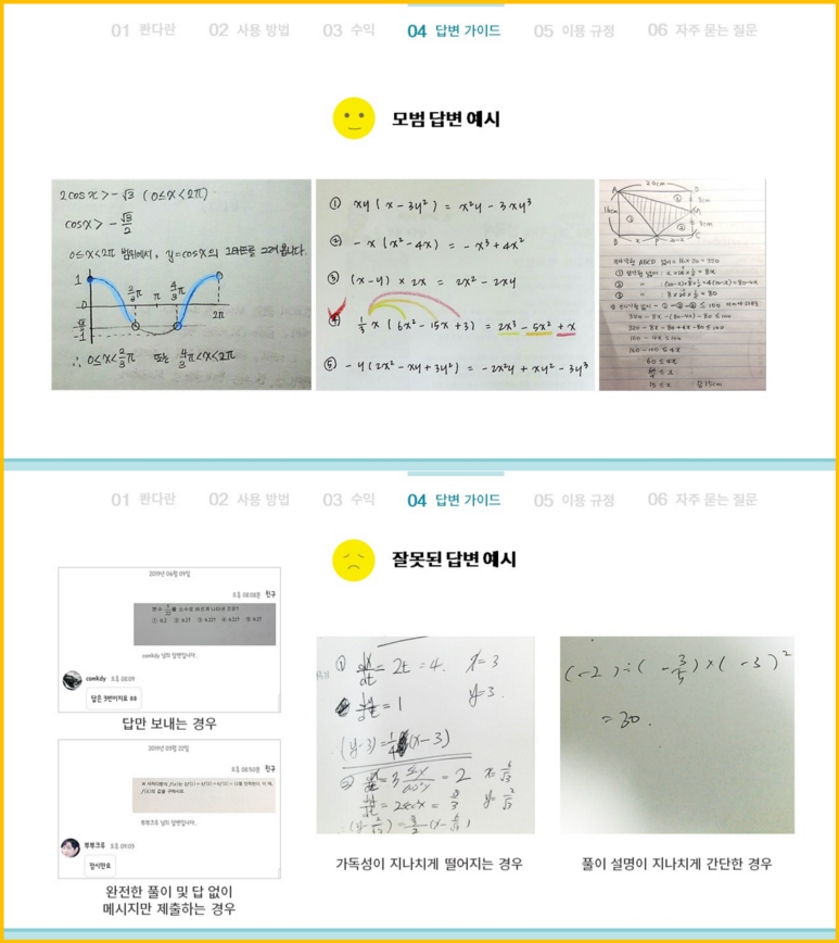 선생님의 답변활동에 대해 콴다가 제시하고 있는 기본적인 가이드라인을 조금 더 쉽게 이해하실 수 있도록 모범 답변과 잘못된 답변의 대표적인 예시들을 이미지로 추가하였고,