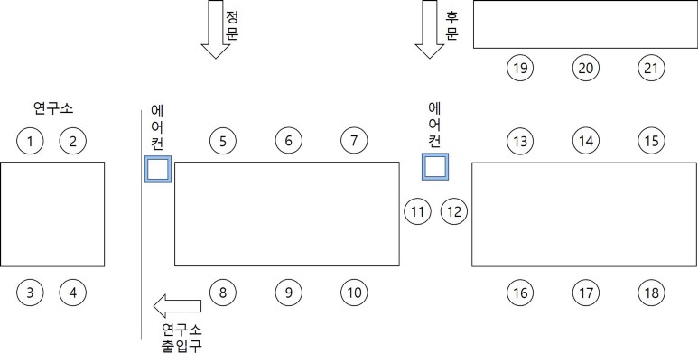 단점 : 후문과의 거리가 가깝다. 이것이 왜 단점에도 적혀있냐하면, 보통 흡연을 하는 직원들이 후문을 나간 공간에서 담배를 피우곤 하는데, 그 담배냄새가 모든 자리중에 가장 심하게 나는 자리다. 흡연자는 그나마 내성이 있지만 비흡연자에게는 굉장히 불편할 수 있다. 또한 에어컨 바람도 직접 들이치는건 아니지만 조금 추울수 있는 자리고, 겨울에는 후문이 열릴때마다 찬바람이 들이치는데다가 문이 닫혀있어도 이상하게 발이 시린 자리다. 여름의 연구실과 겨울의 19번은 절대 피해야하는 자리다. 또 블라인드를 하지 않으면 햇빛이 비치는 자리이기도 하다.