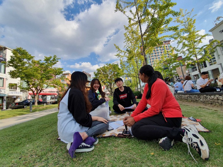 연남동 잔디밭에서 회의하는 매프인들의 모습