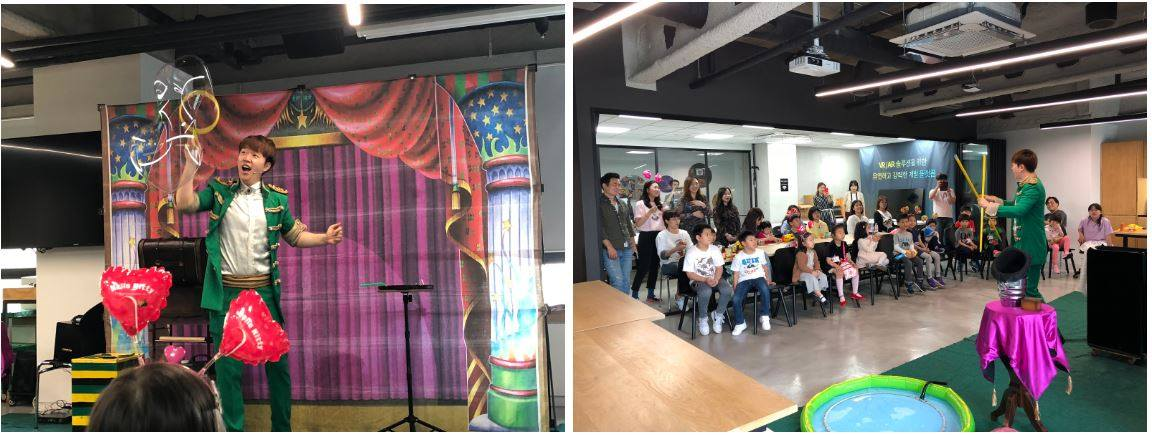 아이들과 함께하는 시간인만큼 다양한 놀이를 준비했는데요! 마술사를 초대해 아이들이 직접 마술을 수행해보며 신비함을 경험하는 시간을 가졌습니다. 거대한 비누방울 속에 들어가고, 눈 앞에서 공중부양하는 물건에 놀라하는 아이들을 보며 모두가 동심으로 돌아갈 수 있는 시간이었지요.