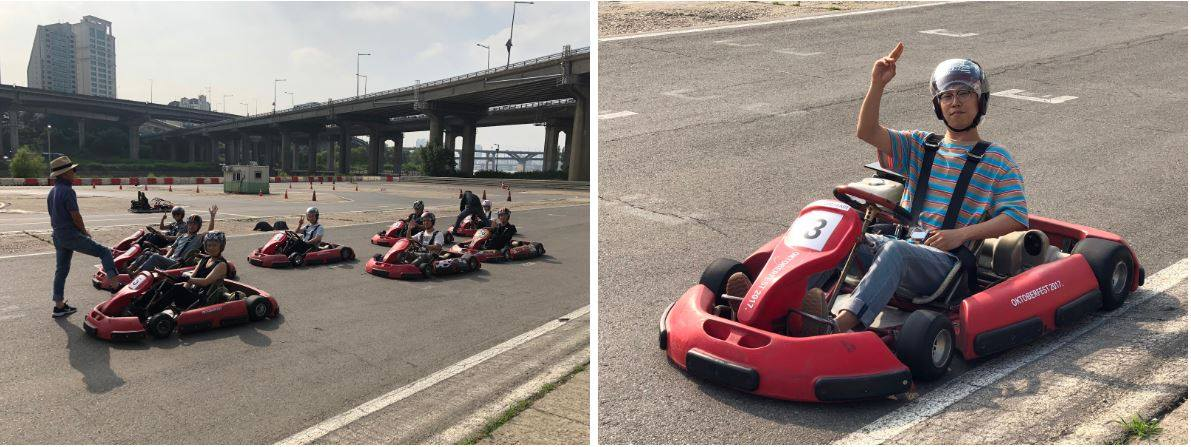 더위가 찾아올 무렵인 6월에는 도심속 카트라이딩을 즐기러 사무실이 아닌 한강으로 떠났습니다! 엄청난 속도에 시원한 바람을 맞으며 달리니 스트레스가 절로 날아가는 짜릿한 시간이 있었답니다. 빠른 속도로 달리는 만큼 안전이 가장 중요하기에 올바른 운전방식, 안전 장비 착용에 대해 꼼꼼히 배우고 체크한 후 시작되었습니다. 모두가 장비를 갖추고 마음의 준비가 된 후에 질주가 드디어 시작됐습니다!