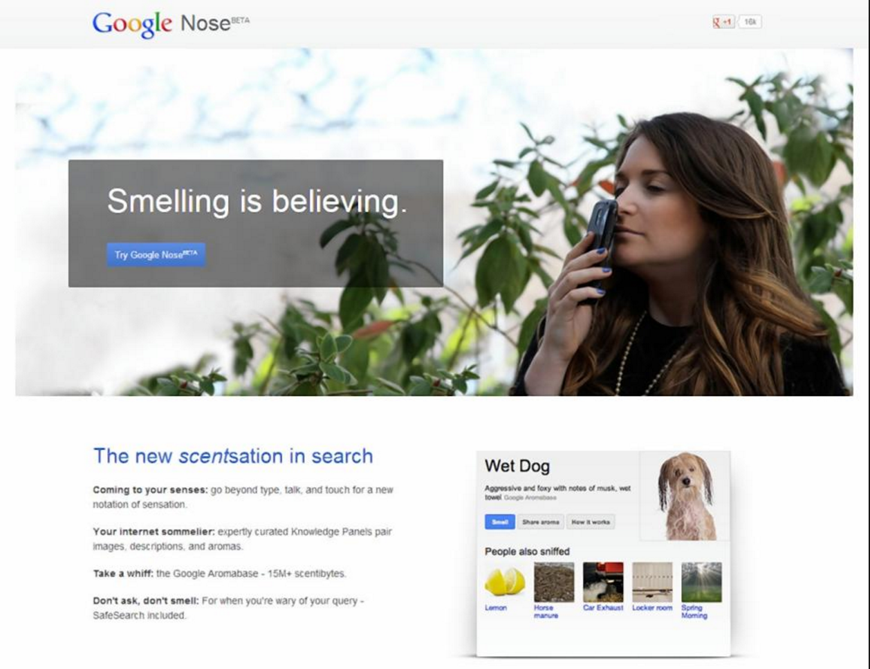 몇 년 전 Google이 Google Nose beta 가 출시되었음을 알렸는데, 검색한 키워드의 냄새가 랩탑, 스마트 폰 등을 통해서 확인이 가능하다는 것이었음. 난 이게 만우절 농담인지 모르고 (ㅡㅡ;;), 진짜 세상이 많이 발전했구나 역시 구글!!!...이라고 생각하였으나.. 너무나도 진지한 만우절 장난이었다는.... You tube 동영상 (꼭 한번 보시길.. 구글이 어찌나 진지하게 이 동영상을 만들었는지 ㅜㅜ)