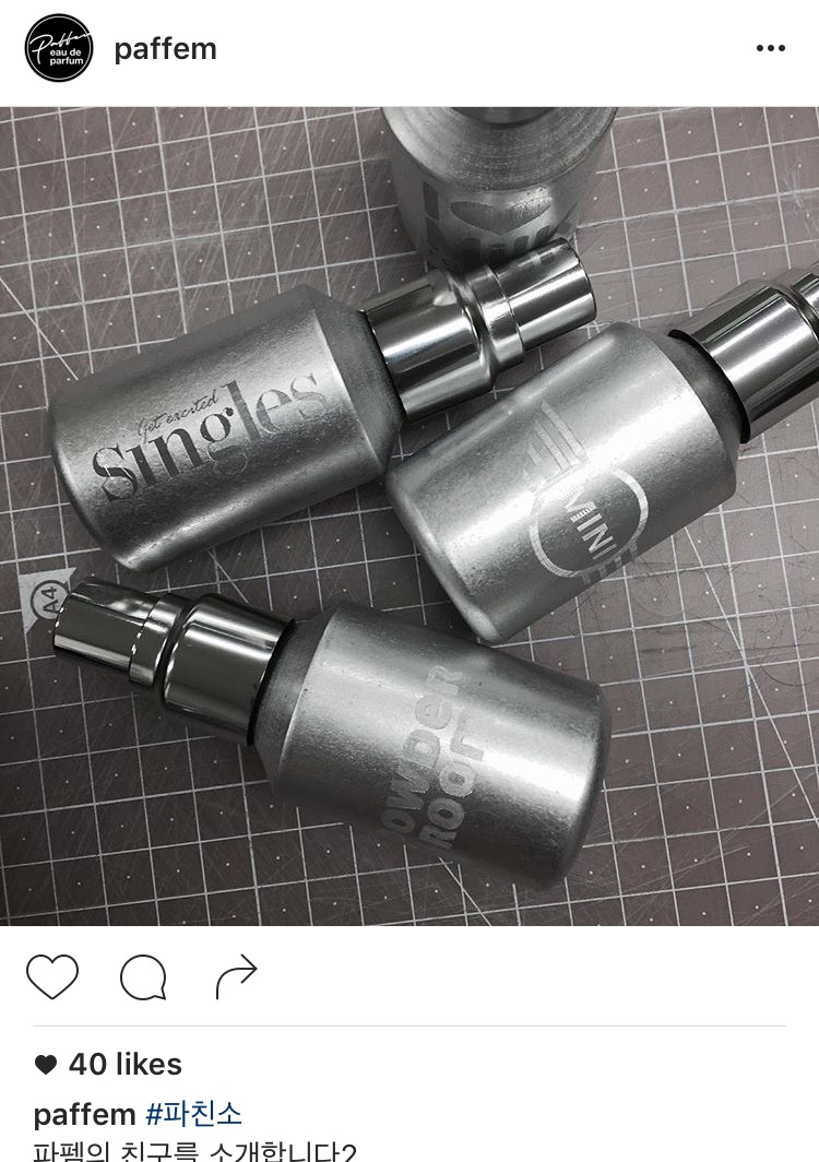 두 번째로, 다양한 design을 소량 생산하기 적합. 어떤 제품/서비스를 콜라보 파트너와 진행하기 위해서는 customization 작업이 필요한데, 파펨은 파트너와 다양한 영역에서 조정 작업이 가능하다. 향을 표현하는 image card의 경우도 쉽게 인쇄를 통해 변경 가능하고, 또한 30ml 제품의 경우는 각인 기계를 직접 구매하였기 때문에, 우리가 원하는 메시지를 쉽게 각인하여 넣을 수 있다. 아래 사진은 우리와 함께 작업하였던 브랜드 예시