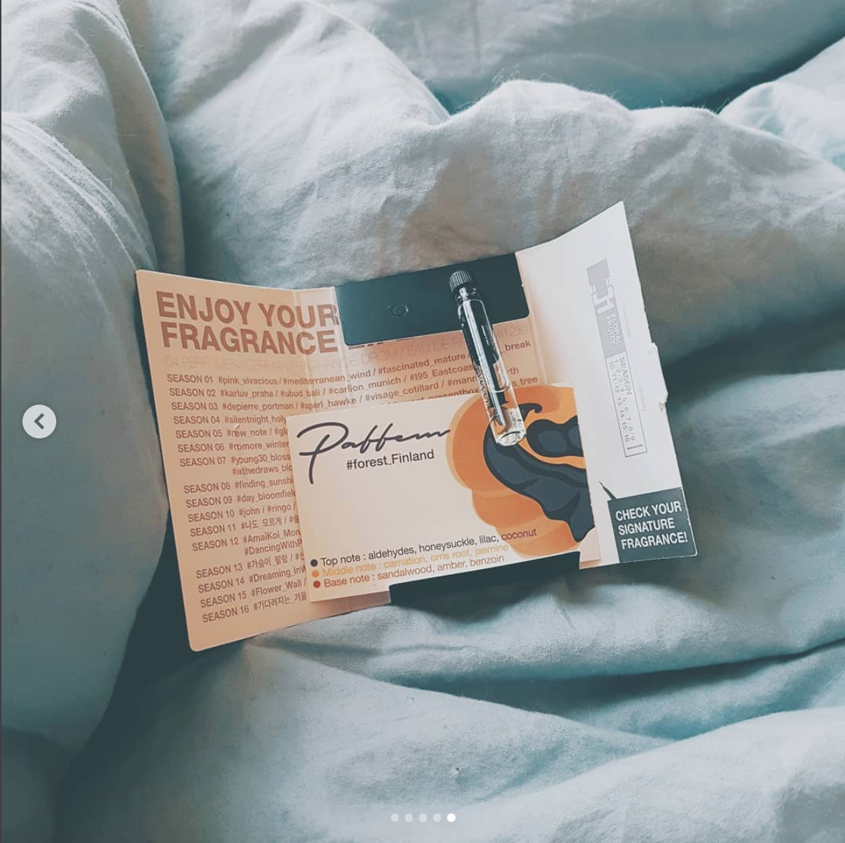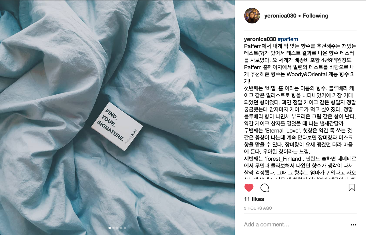 그래서 PerfumeTeller(향수 추천 알고리즘)을 만들고 고객 취향에 맞는 파펨의 64가지 제품들을 구매 전에 시향 해볼 수 있는 tria kit를 운영하고 있습니다. 트라이얼 키트를 받아보고 고객이 남겨주신 인스타그램 후기를 잠시 공개하면..