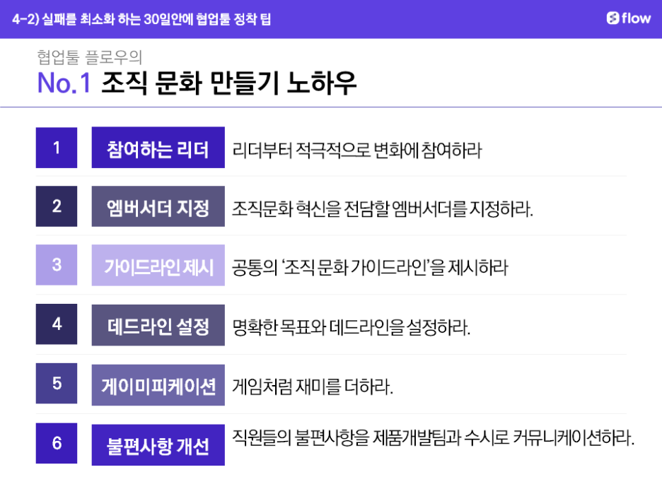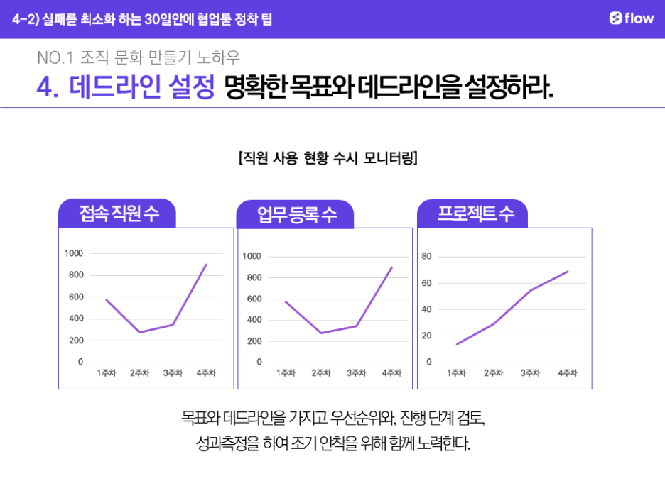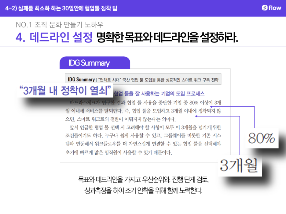 6년여간의 플로우 데이터들을 살펴보면 협업툴 사용을 중단한 기업 중 80%가 3개월 이내에 서비스를 탈퇴하는 경우로서 바꿔 이야기하면 3개월 이내에 정착되지 못하면 디지털 워크로 전환되기가 어렵다는 내용입니다. 그래서 도입 후 3개월이 골든타임이라고 볼 수 있고 목표와 데드라인을 가지고 우선순위, 진행단계검토, 성과측정을 하여 조기 안착을 할 수 있도록 해야 합니다.