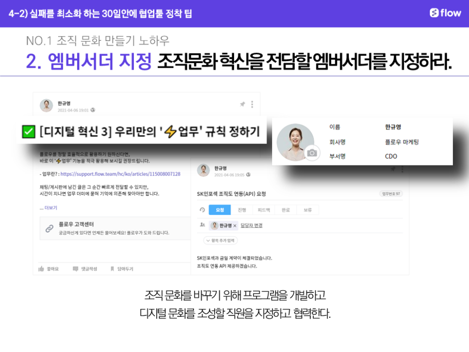 협업툴 도입 시에도 일종의 엠버서더를 지정하여 그 시스템을 초반에 이끌어 나갈 역할을 설정해 주는 것이 필요합니다.