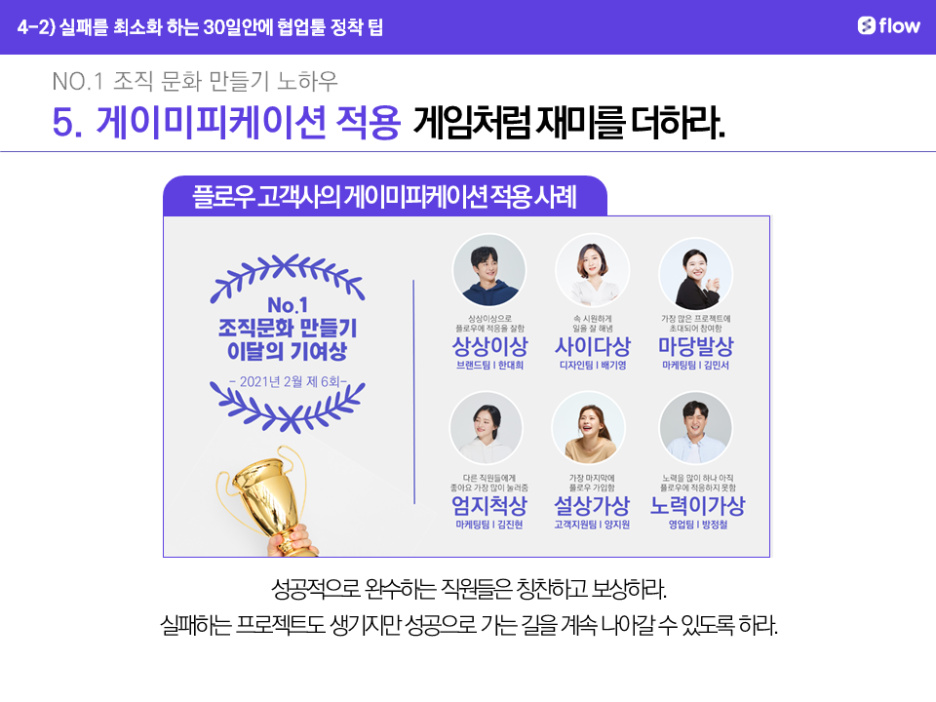 일이나 공부보다는 놀이나 게임은 그 자체에 재미가 있기 때문에 누가 시키지 않아도 자발적이고 적극적으로 할 수 있는데 협업툴 사용 또한 이러한 방식으로 접근하게 됩니다면 좀 더 친숙하면서 재미를 더해 조직에 정착할 수 있도록 유도할 수 있습니다. 플로우에서는 협업툴의 도입하는 조직문화를 분석하여 게이미피케이션을 적용할 수 있는지를 논의하고 되도록 이 방식을 도입하도록 권장하고 있으며 도입 후 데이터의 비교 결과 게이미피케이션 방식을 함께 적용한 기업들이 그렇게 하지 않은 기업보다 협업툴 이탈률이 낮고 더 빠르게 정착됩니다는 결과를 얻을 수 있었습니다.