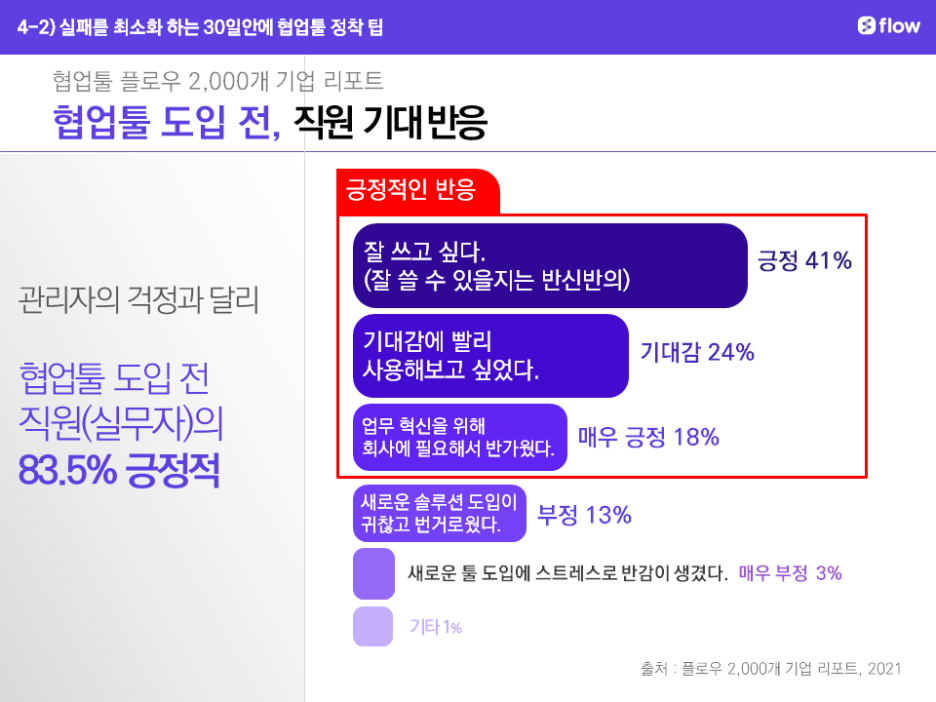 플로우에서는 정기적으로 협업툴을 도입한 조직을 대상으로 설문 조사를 진행하는데 도입 담당자의 걱정과는 달리 협업툴 도입 전 직원 기대 반응은 83.5%가 긍정 이상의 기대감을 보였다. 이러한 이유는 새로운 시스템을 도입한다는 것은 실무자 입장에서는 분명 번거로운 일이 될 수 있지만 디지털 디바이스의 보급 확대와 재택 및 원격근무가 활성화됨에 따라 관리자의 관점이 아닌 실무자의 관점에서도 유비쿼터스의 업무가 가능하도록 하고 스마트 워크를 할 수 있도록 도와주는 협업툴이라는 존재의 도입은 반가운 일이 되었다고 볼 수 있고, 실제 대기업 및 혁신기업들에서는 이미 협업툴 사용으로 업무 효율성이 증대되고 그러한 효과는 실무자의 업무 편의를 증대시킨다는 결과를 숙지하고 있기 때문일 것이다.