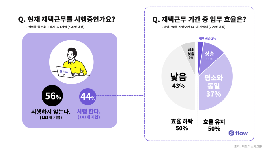 저희는 2020년 플로우 고객사를 대상으로 '재택근무 실태조사'를 진행했습니다. 코로나 19 확산으로 긴급 재택근무 시행하는 기업이 급증하고 있는 이 시점에 재택근무시 협업툴이 업무 생산성에 미치는 영향과 현재 기업들이 겪고 있는 어려움을 진단하는데 많은 도움이 되었습니다. 그 설문조사 결과를 함께 공유하겠습니다. 본 설문조사는 총 '321개 기업' 520명이 참여하였습니다.