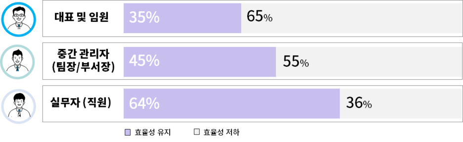 매우 흥미로운 결과입니다. 재택근무 업무 효율성 평가는 직책별 큰 차이가 있습니다. 직책별로 재택근무 업무 효율성이 유지됐다고 긍정적으로 답변한 비중을 보면, 대표 및 임원(35%),중간관리자(45%),실무자(64%)다. 직책이 높을수록 재택근무는 업무 효율성이 저하된다고 평가됩니다.