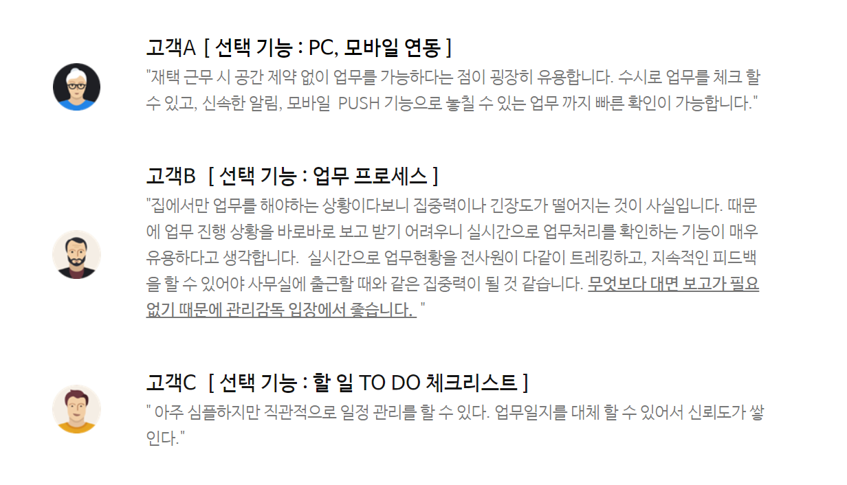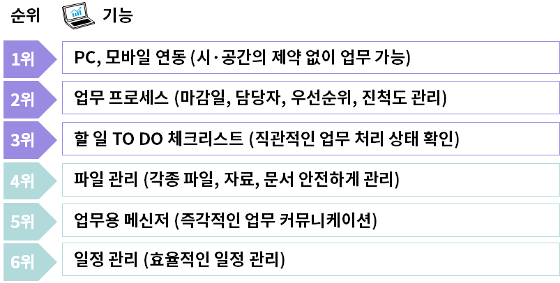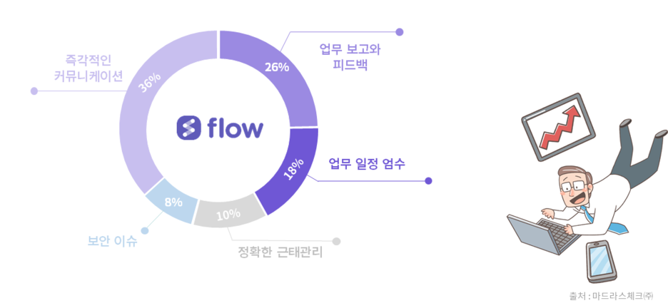 플로우 고객사는 위와 같은 순서로 재택근무의 유용한 플로우를 기능을 뽑았습니다. 노트북과 모바일만 있으면 출근까지 10초. 플로우로 로그인만 하면, 언제 어디서든 업무를 볼 수 있다는 점에서 'PC / 모바일 연동' 기능이 1위로 선정 된 것으로 분석됩니다.