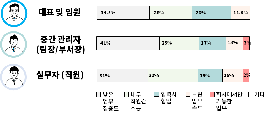 위와 같은 순서로 답변은 직책과 관계없이 비슷한 결과가 나왔습니다. 개인의 주거 공간(집)에서는 자율성이 생기고 여러 상황에 따라 업무에 몰입하지 못하고 업무 리듬이 깨지기 쉽기 때문에 '낮은 업무 집중도'는 누구나 염려하는 가장 큰 요인으로 분석됩니다.