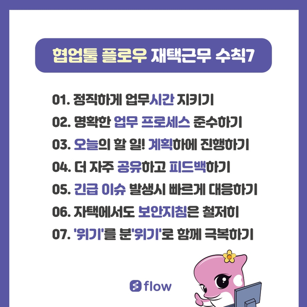 < 협업툴 플로우 재택근무 실행 수칙 7 >을 안내드리려고 합니다. 업종과 조직의 특성에 따라 최적화된 재택근무방법이 다를 수 있지만, 본 글을 참고하여 재택근무를 시행하시는데 도움이 되시길 바라겠습니다.