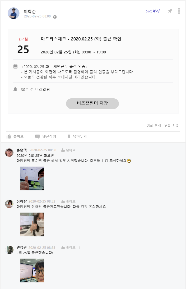 ✅ 직원 : 업무 시작 준비가 완료되면 [금일 출근 확인 게시물]과 함께 사진으로 찍은 후 댓글 작성