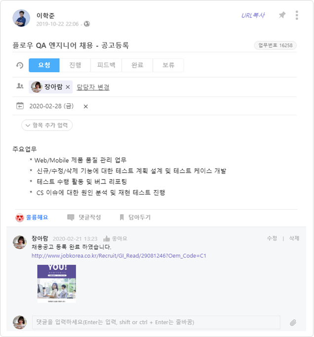 ✅ 처리된 업무는 각 프로젝트 별로 플로우에 실시간으로 공유해 주세요.