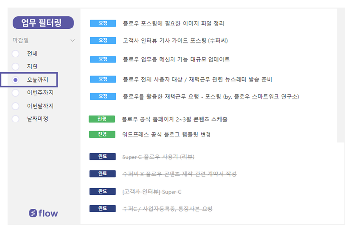 ✅ 플로우로 등록된 모든 업무는 다양한 옵션으로 필터링할 수 있습니다. (마감일/담당자/진척도/우선순위 등)