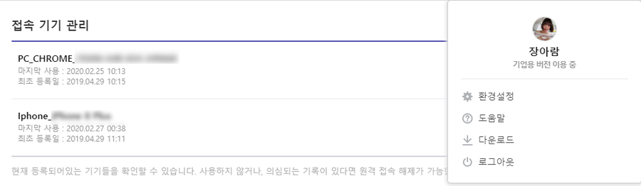 현재 등록되어있는 기기들을 확인할 수 있습니다. 사용하지 않거나, 의심되는 기록이 있다면 원격 접속 해제가 가능합니다.