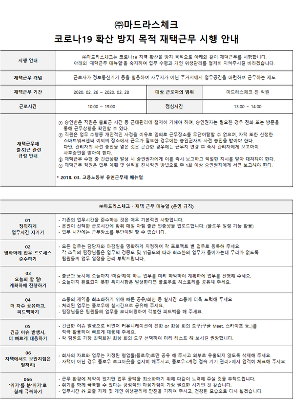 재택근무 경험이 한번도 없는 조직에서 갑작스러운 재택근무를 시행한다면 회사와 직원들 모두 우왕좌왕 할 수 있습니다. 개인 주거 공간에서도 혼란 없이 업무에 적응 할 수 있도록 재택근무 기간 동안 지켜야하는 규정을 '매뉴얼'로 제공 해 주는 것이 좋습니다.