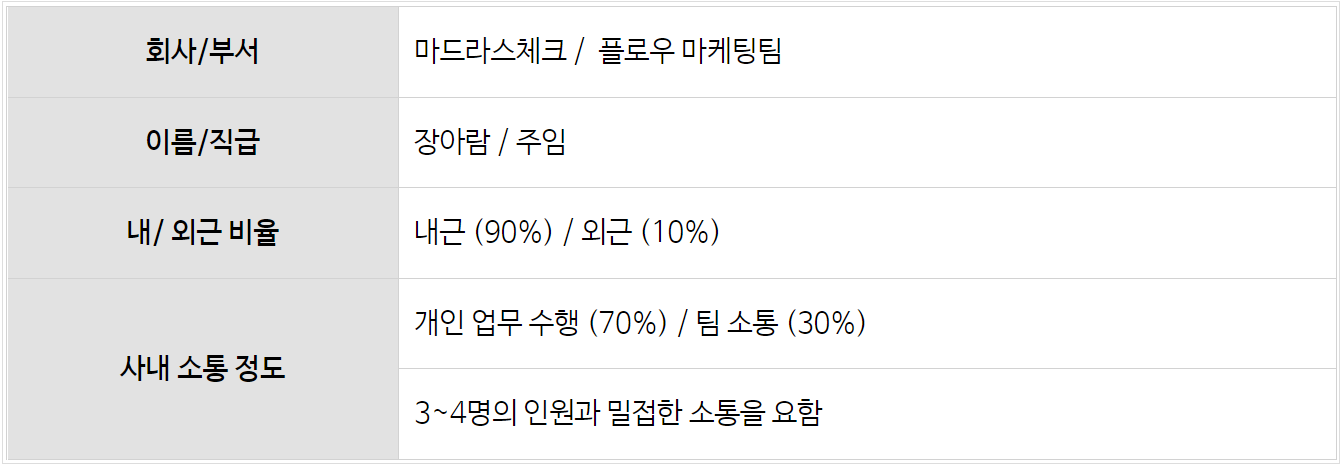 A. 플로우 마케팅 팀 장아람 주임입니다. 마케팅 팀은 업무 특성상 수 많은 업무량 + 타팀 협의 / 대행사 핸들링 / 대표님 최종 컨펌.. 등, 그 어떤 팀보다 커뮤니케이션이 많이 필요합니다. 또한 마케팅은 답이 정해져 있지 않기 때문에 업무가 시행되는 과정 속에서도 중간 피드백 + 수정도 빈번합니다. 퍼포먼스 성과가 좋은 전략을 빠르게 업그레이드하여 성과를 키우고, 성과가 부진한 전략은 중단 결정 or 보완 전략이 필요하기 때문이죠. 최대한 업무 시간을 효율적으로 활용하여 어제보다 더 많은 도전을 하려고 노력하는 플로우 마케팅 팀 입니다.