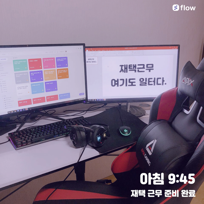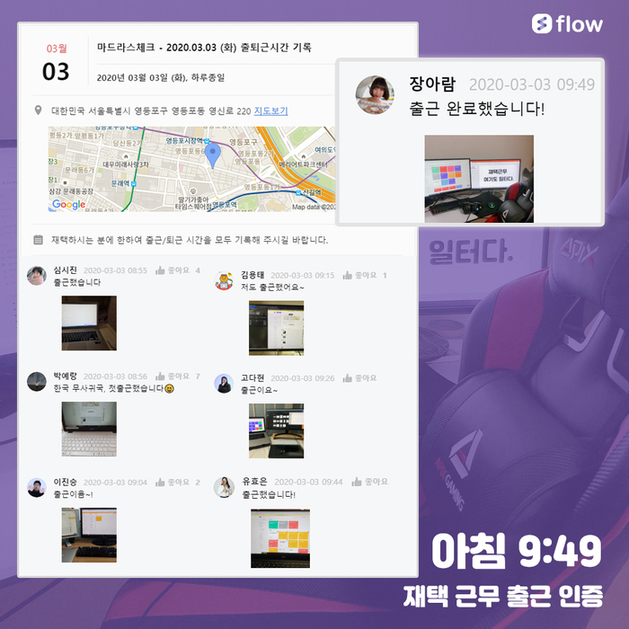 A. 경영 지원 팀에서 매일 아침 플로우로 [오늘의 출근 일정]게시물을 등록하여 줍니다. 각자 본인의 재택 근무지 에서 업무 준비가 완료되면 '실시간 업무 준비 사진'을 찍어서 인증샷을 남기고 있습니다. 회사까지 출근하는 이동 시간이 줄어드니 30분 정도 아침 뉴스 (코로나19 사태 현황)를 보다가 다른 직원들의 출근 알림을 확인하고 저도 업무 시작을 함께 했습니다.